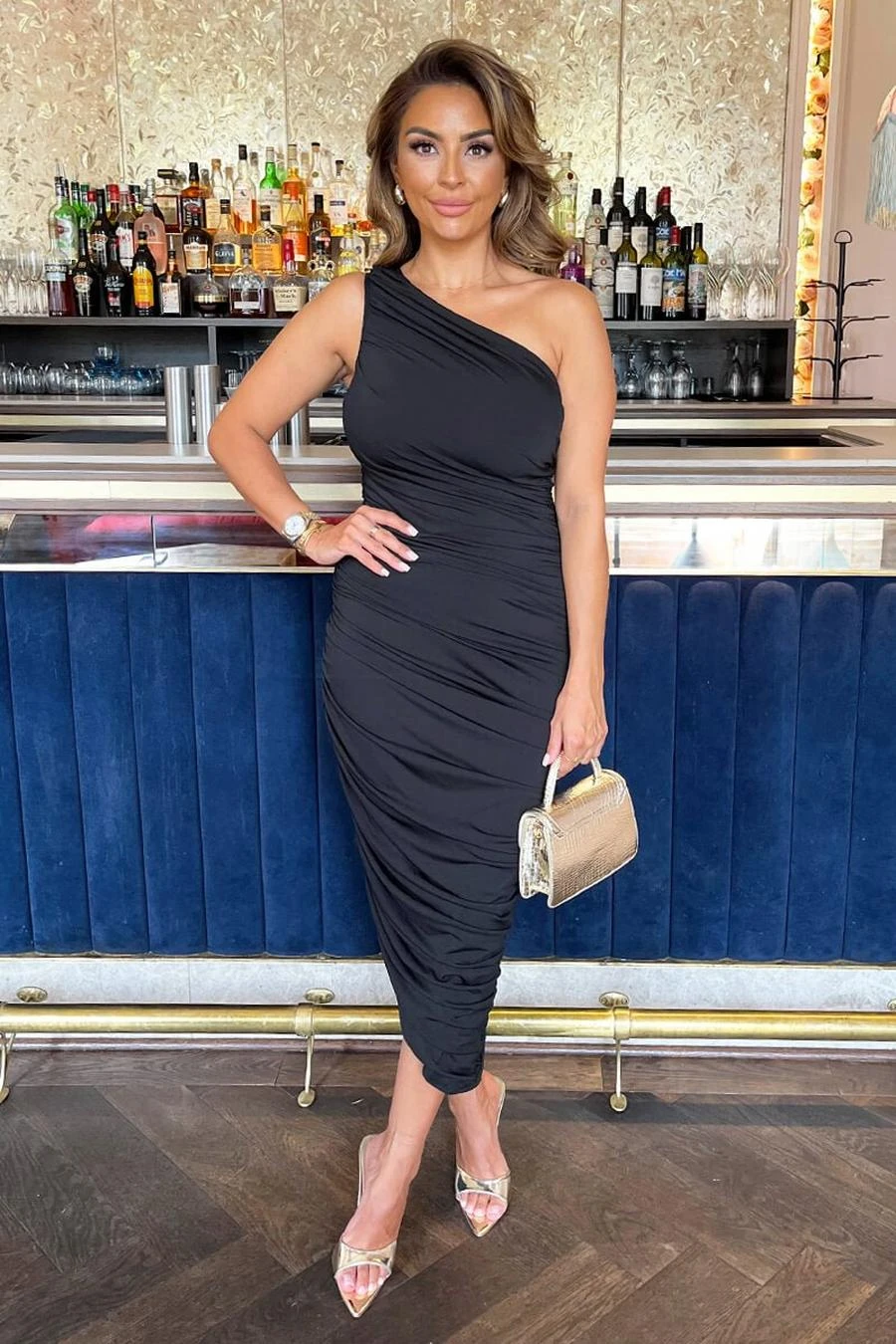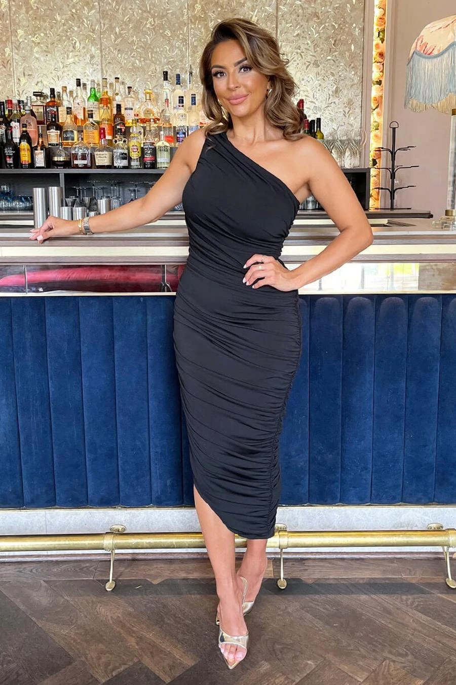 Our Black One Shoulder Asymmetric Hem Ruched Midi Dress is perfectfor showing off those curves. Made from sculpting premium stretchjersey, it features a one shoulder top design, ruched detailing and anasymmetric hem. Team it with strappy heels and a clutch for a superversatile look perfect for all your special occasions. Model wears: UK 10/ EU 38/ US 6Model’s height: 168cm/ 5’6″Approx length from centre back to hem: 115 cmFabric composition: 100% PolyesterColour: BLACK