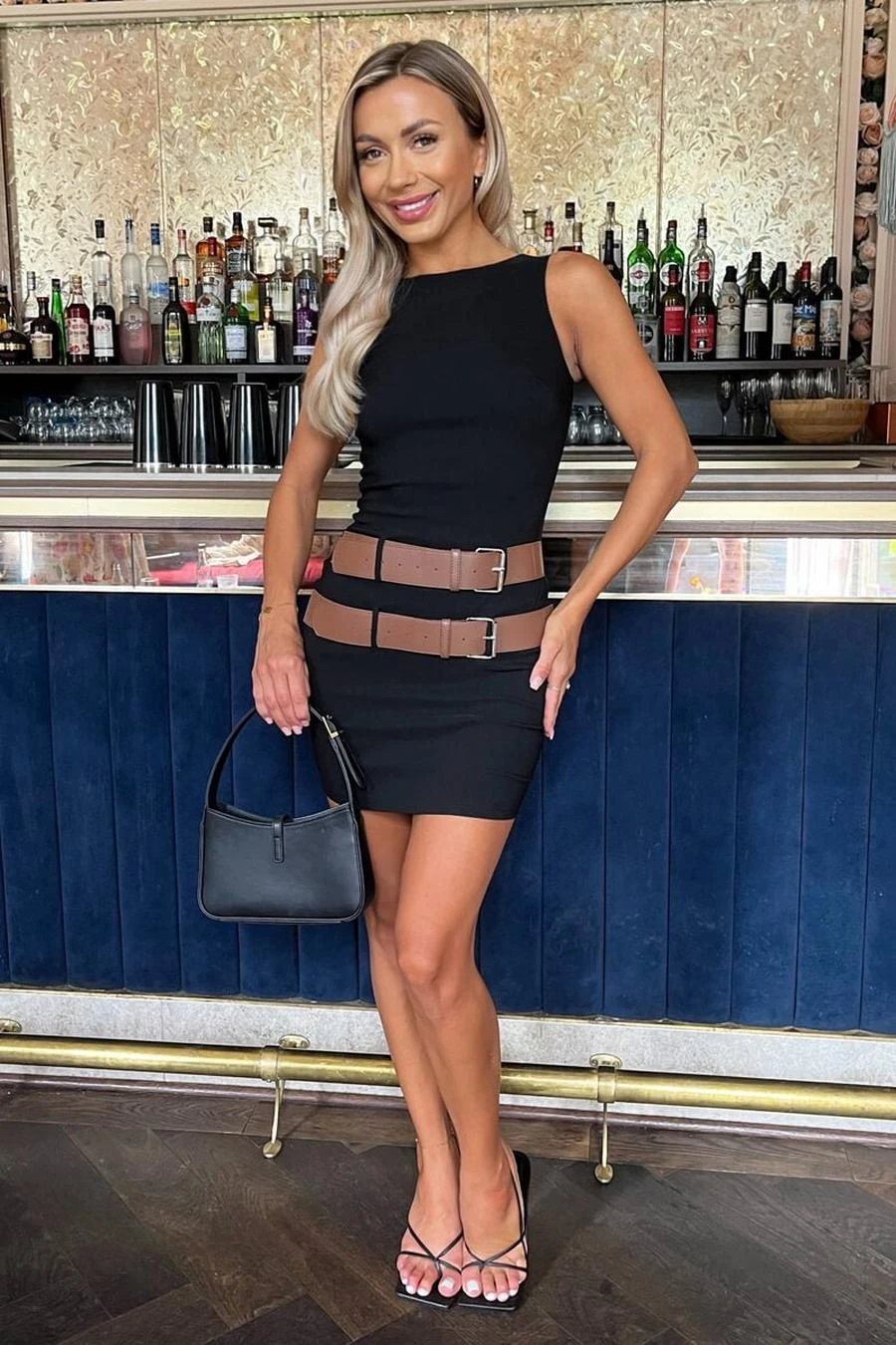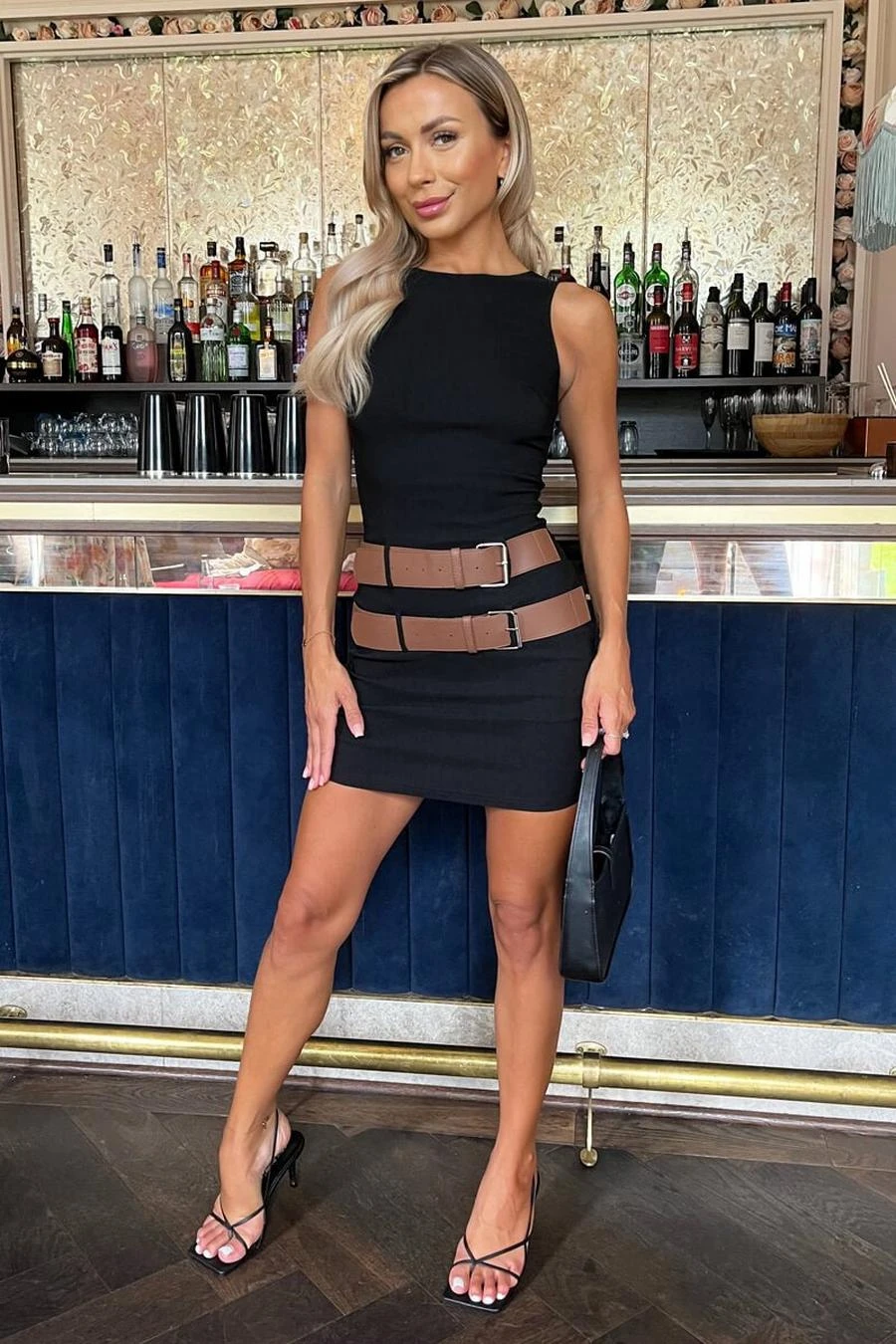 Stand out from the crowd in our Black Sleeveless Double Belt Detail Bodycon Midi Dress. Featuring our comfortable stretch cotton fabric, a bodycon silhouette, round neckline, two front faux tan belts, and a zip up back. Dress it up with heels and a matching bag for a modern and stylish night out outfit. Model wears: UK 8/ EU 36/ US 4 Model’s height: 165cm/ 5’5″ Approx length from centre to hem: 79 cm Fabric composition: 65% Rayon Cotton 35% Nylon Colour: BLACK