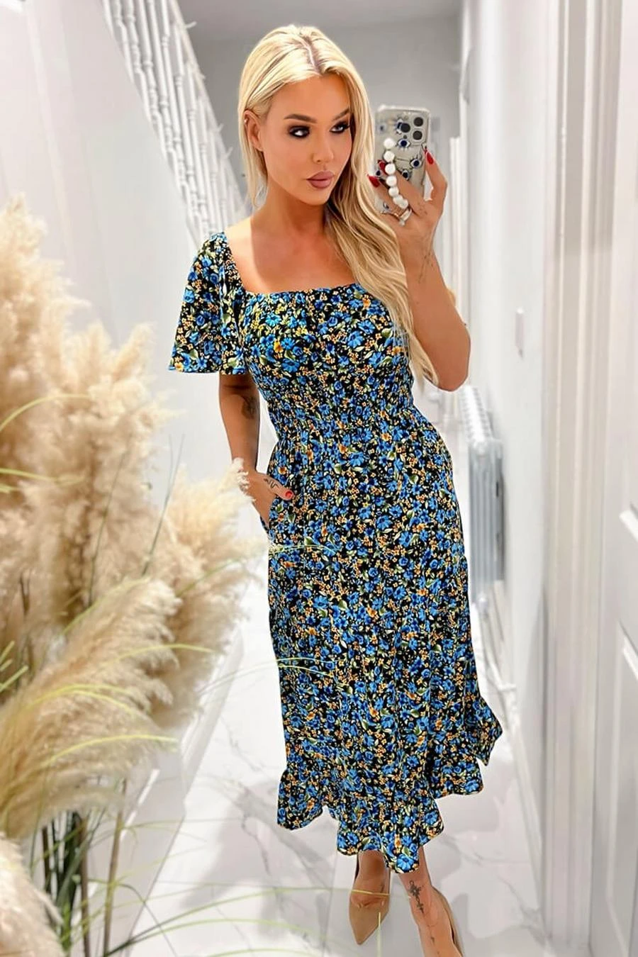 AX Paris Blue Floral Printed Flutter Sleeve Midi Smock Dress