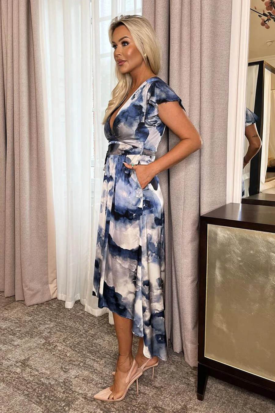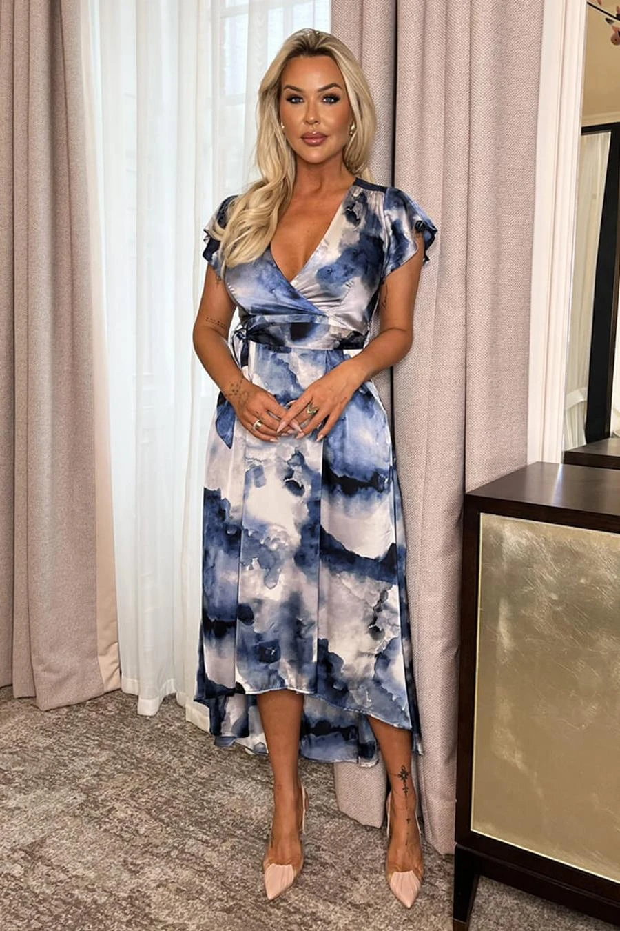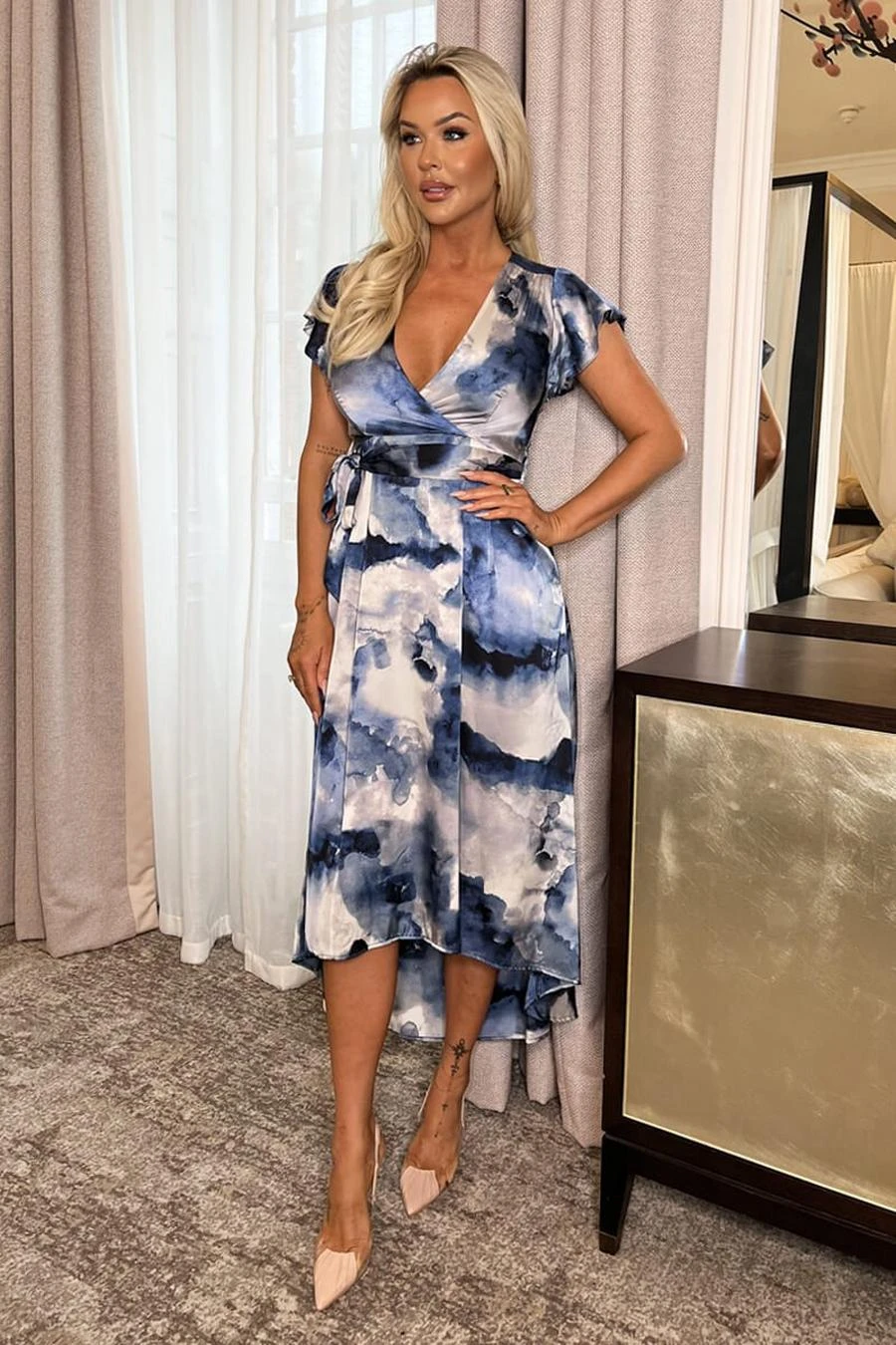 Be right on trend in our Blue Marble Print Short Sleeve Belted Wrap Midi Dress! Featuring our gorgeous satin-feel printed fabric, short flutter sleeves, a lined wrap over top, an elasticated back waist, a tie belt, a flowy midi skirt with a slightly dipped hem and a zip up back. Simply pair with your favourite heels and accessories to complete the look. Model wears: UK 8/ EU 36/ US 4 Model’s height: 175cm/ 5’9″ Approx length from centre back to hem: 138 cm Fabric composition: 100% Polyester Colour: BLUE *print position may vary*