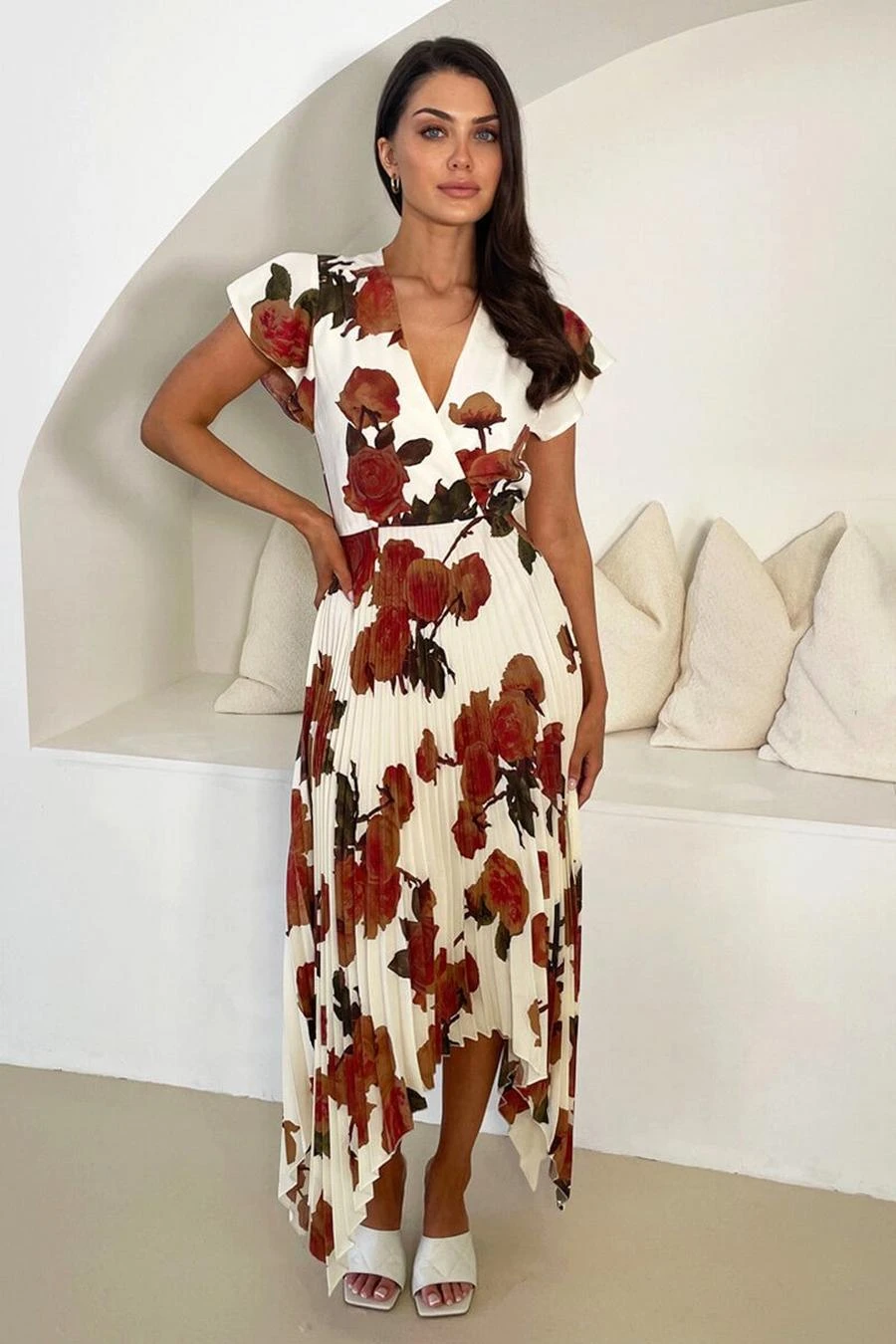 AX Paris Cream Floral Print Wrap Top Asymmetrical Hem Pleated Midi Dress