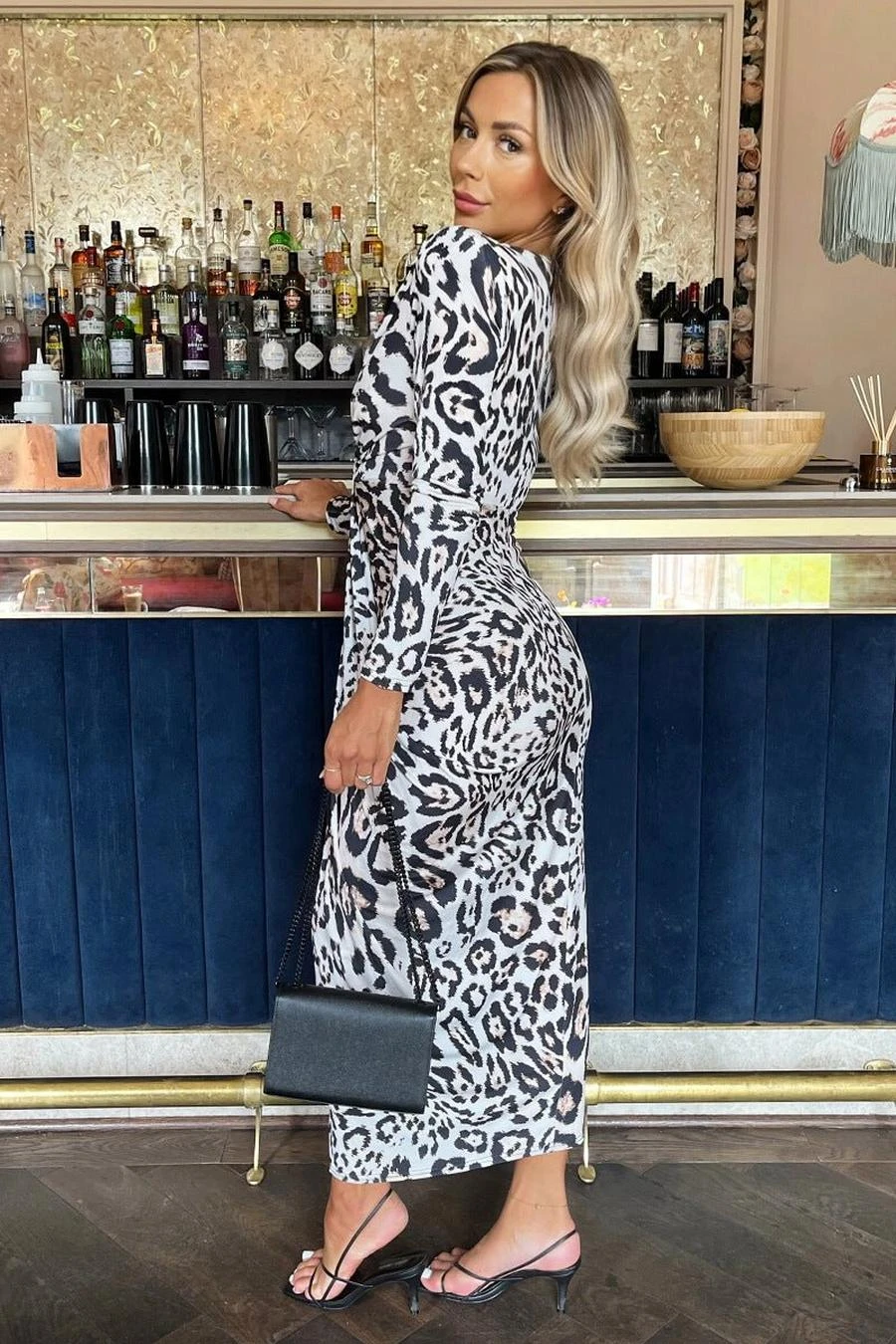 AX Paris Cream Leopard Print Long Sleeve V Neck Knot Drape Midi Dress
