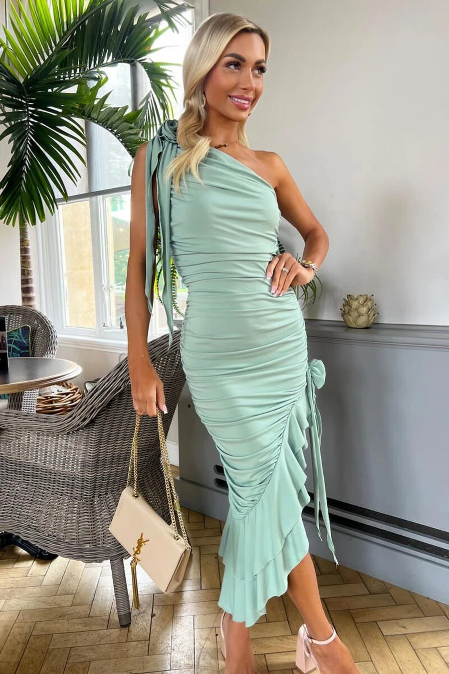 AX Paris Duck Egg One Shoulder Ruched Asymmetrical Frill Midi Dress With Flower Details
