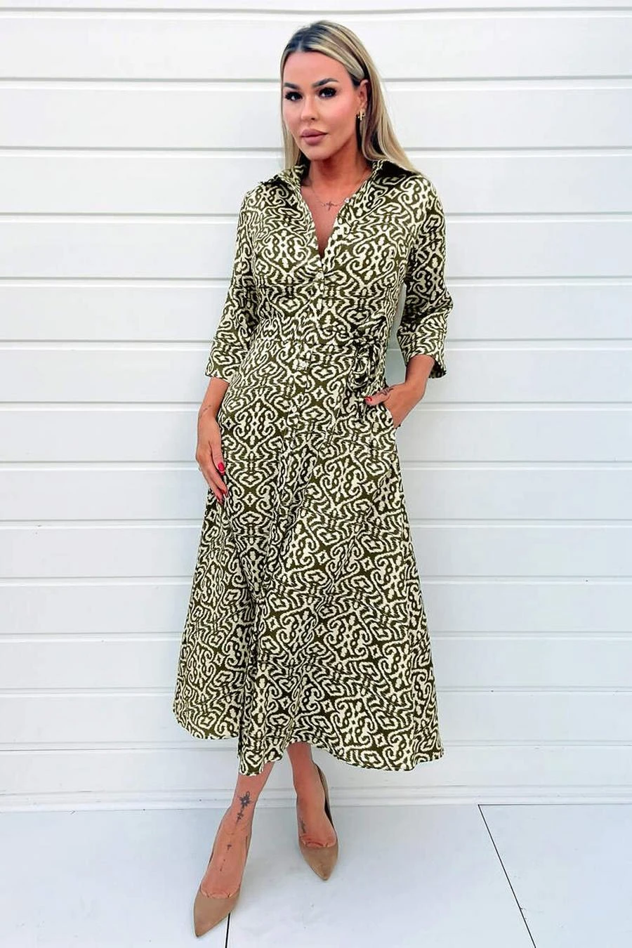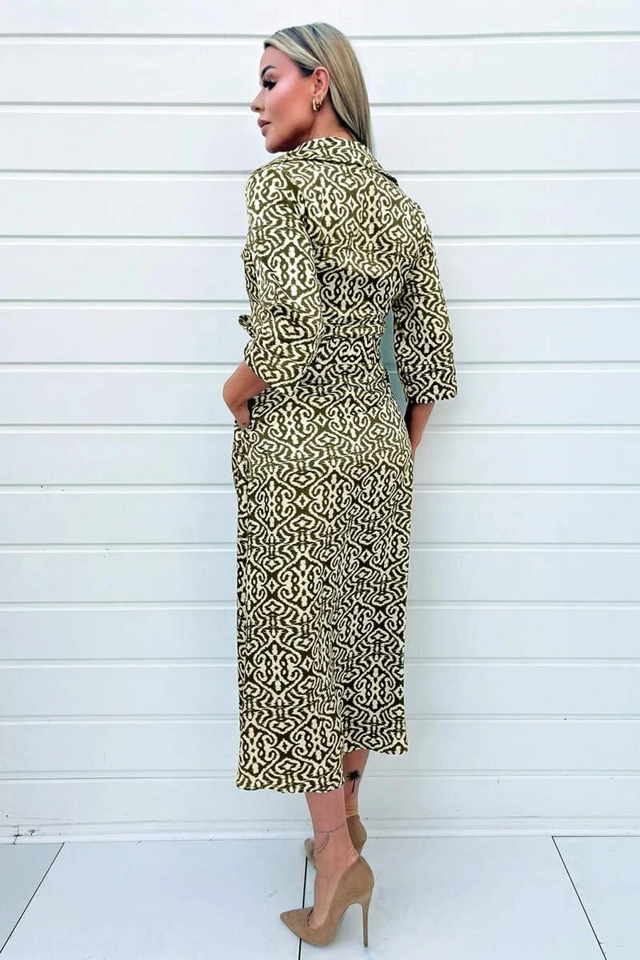 AX Paris Khaki And Cream Print Shirt Midi Dress