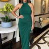 Our Khaki Round Neck Ribbed Top Tiered Skirt Midi Dress will be yournew summer go-to. Featuring a ribbed sleeveless top, a round neckline,a tiered smock-style midi skirt and a zip up back. Wear it with flatsfor a super cute day look, or dress it up with heels for the evening.Model wears: UK 8/ EU 36/ US 4Model’s height: 173cm/ 5’8″Approx length from side of neck to hem: 128cmFabric composition: 100% PolyesterColour: KHAKI