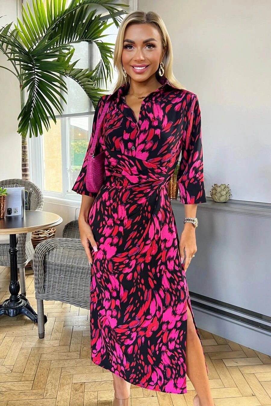 Stay on trend with this Pink And Red Printed Shirt Midi Dress. Featuring 3/4 length cuffed sleeves , a classic collar, a button front top with side drape detail, an elasticated waist back and a midi length skirt with side splits. . Style with flats or heels and add some sophisticated jewellery for a chic evening look. Model wears: UK 8/ EU 36/ US 4 Model’s height: 165cm/ 5’5″ Approx length from centre back to hem: 125cm Fabric composition: 100% Polyester Colour: PINK *print position may vary*