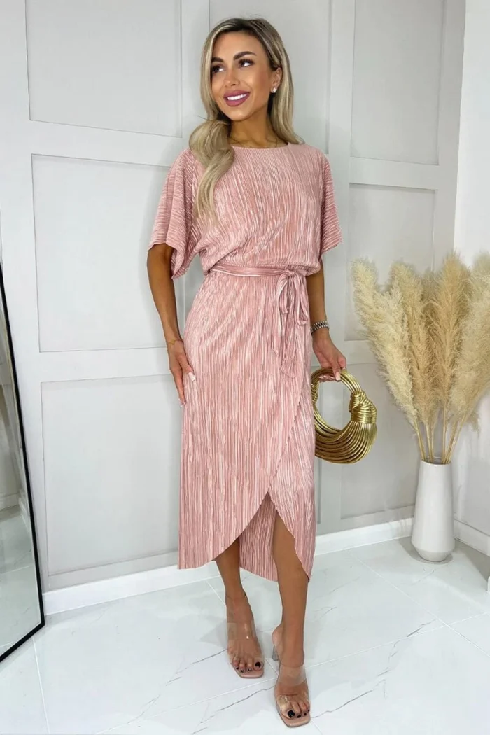 AX Paris Champagne Short Sleeve Tie Waist Plisse Midi Dress