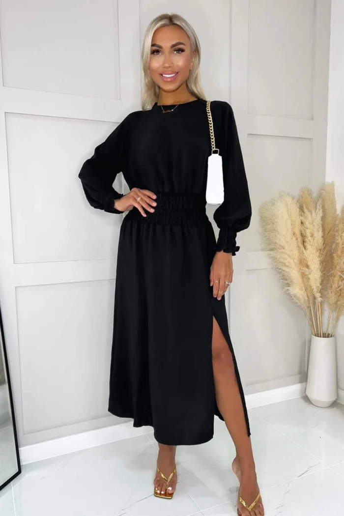 AX Paris Black Long Sleeve Shirred Detail Midi Dress