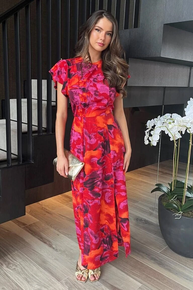 AX Paris Orange And Purple Abstract Print Flutter Sleeve Midi Dress