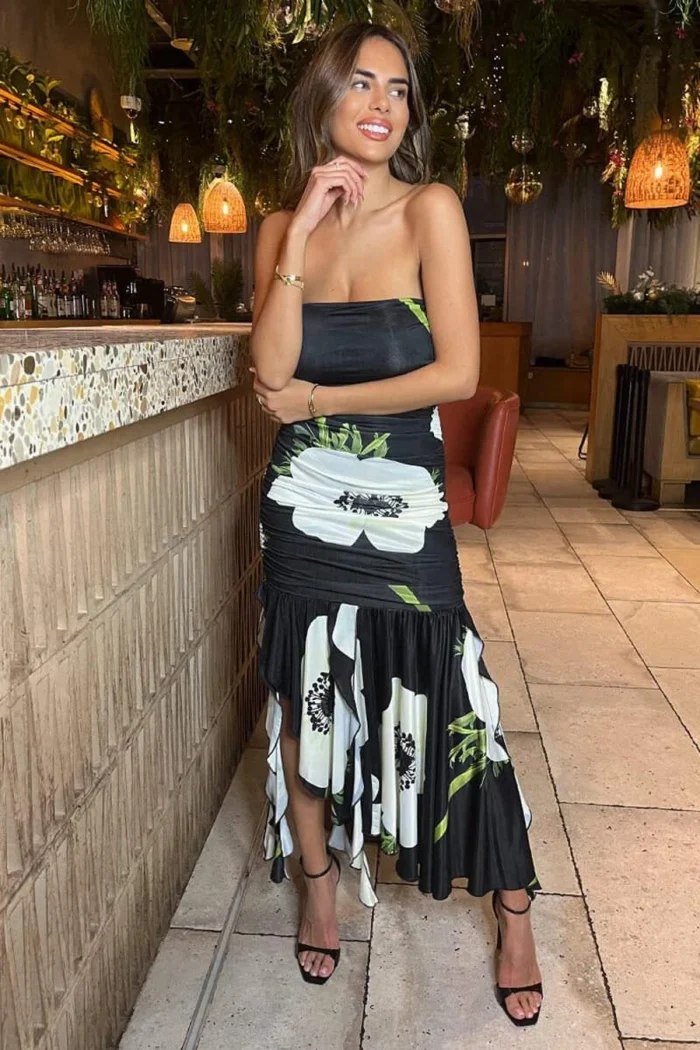 AX Paris Black Floral Printed Strapless Ruched Midi Dress