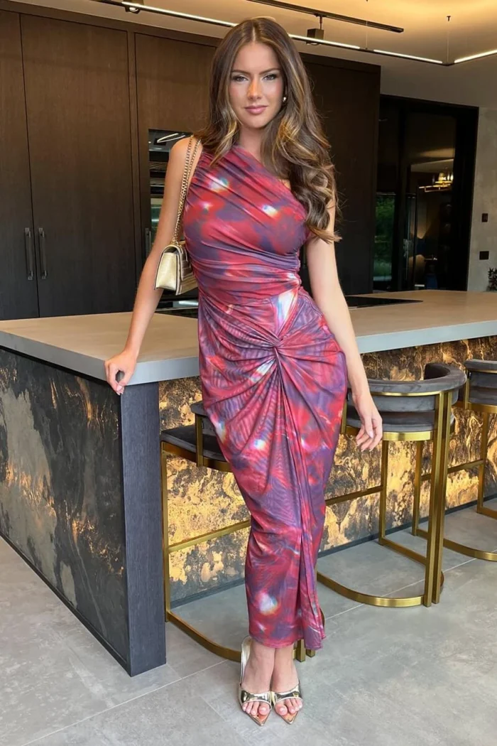 AX Paris Red Tie Dye Print One Shoulder Knot Skirt Mesh Midi Dress