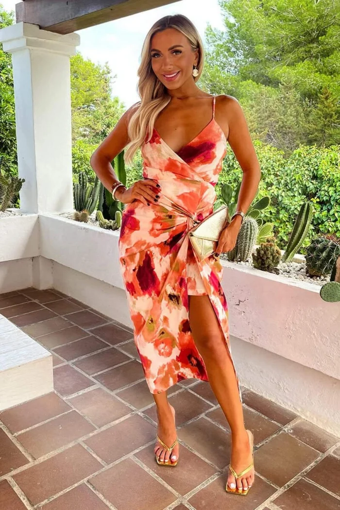 AX Paris Peach Smudge Print Strappy Wrap Top Knot Skirt Midi Dress