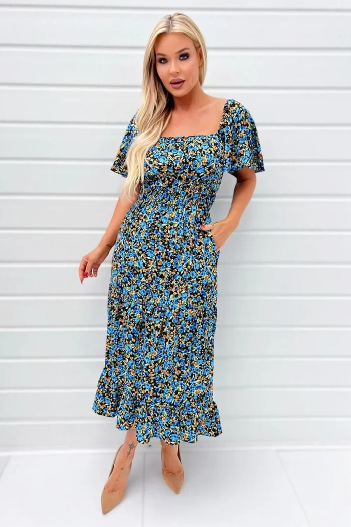 AX Paris Blue Floral Printed Flutter Sleeve Midi Smock Dress