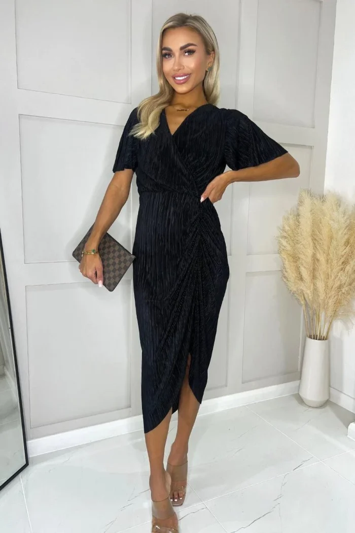 AX Paris Black Wrap Top Short Sleeve Plisse Gathered Midi Dress