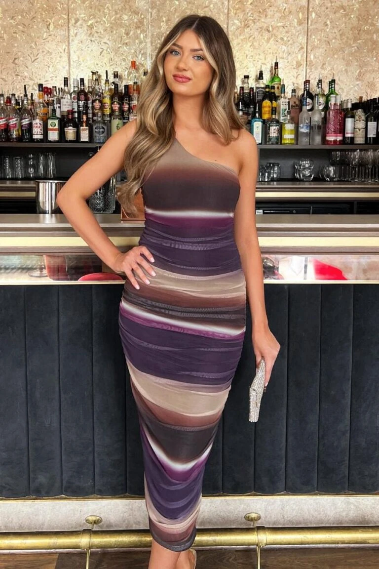 AX Paris Plum Abstract Print Mesh One Shoulder Bodycon Midi Dress