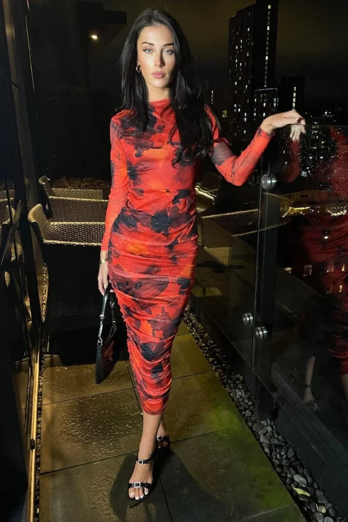 AX Paris Red Printed Mesh Long Sleeve Bodycon Midi Dress