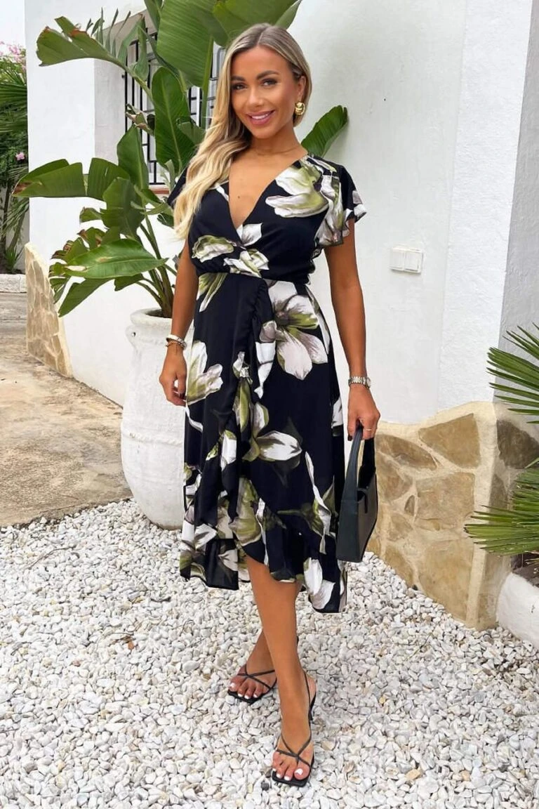 AX Paris Black And White Floral Print Frill Hem Wrap Midi Dress