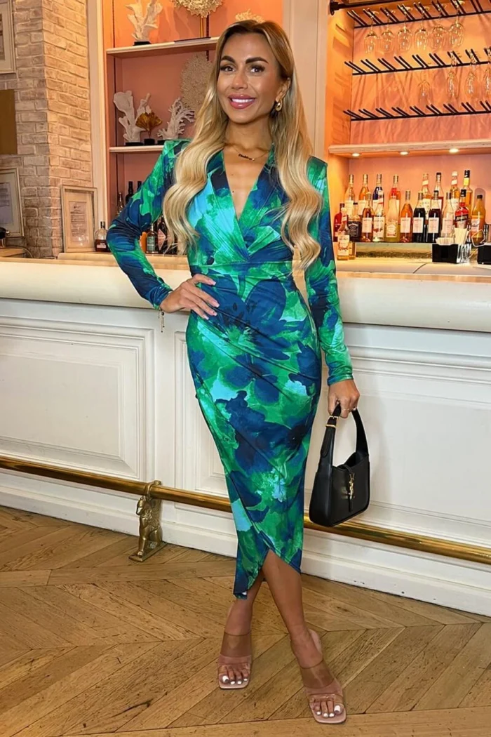 AX Paris Green Printed Long Sleeve Wrap Midi Dress